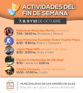 Actividades del fin de semana: “Folklore en Plaza San Martín” - 7/10 - 19:30 hs, Rivadavia y Moreno Este viernes te esperamos para compartir una jornada a pura música! Show en vivo del Taller de danza Pueblos y Parajes, la Compañía municipal “Camino Real” y el Ballet folklórico Santa Cecilia, de la ciudad de Mercedes. Show musical a cargo de “Pies de Barro”. La artista Sandra Piñeiro estará trabajando en vivo sobre los escudos patrios con mosaiquismo. Feria de artesanos y emprendedores locales.