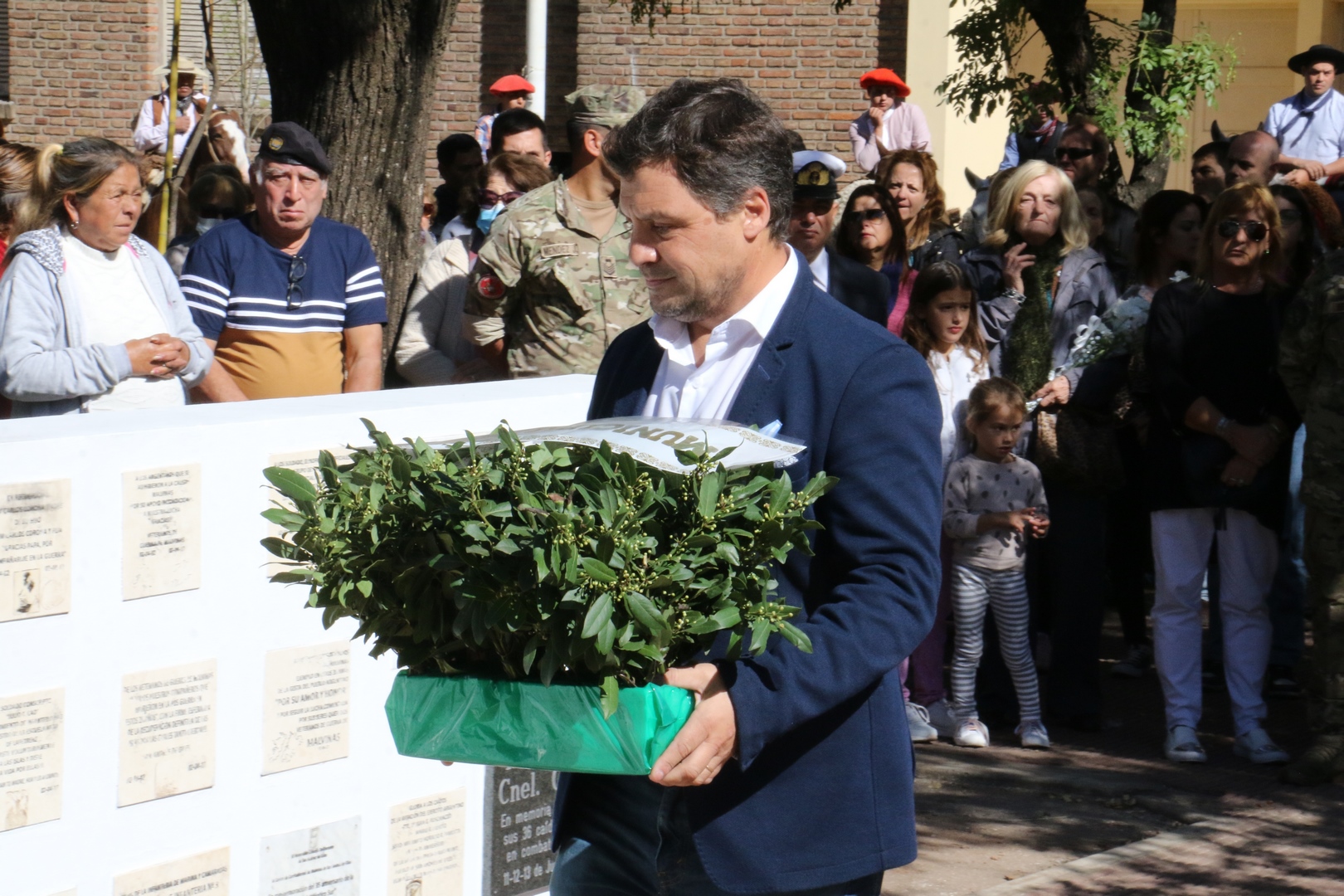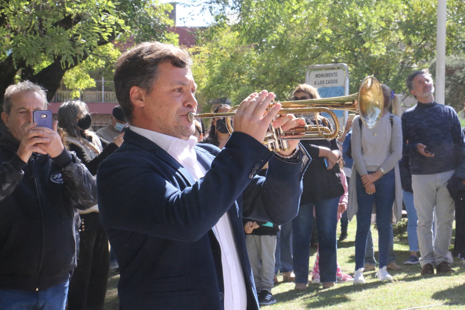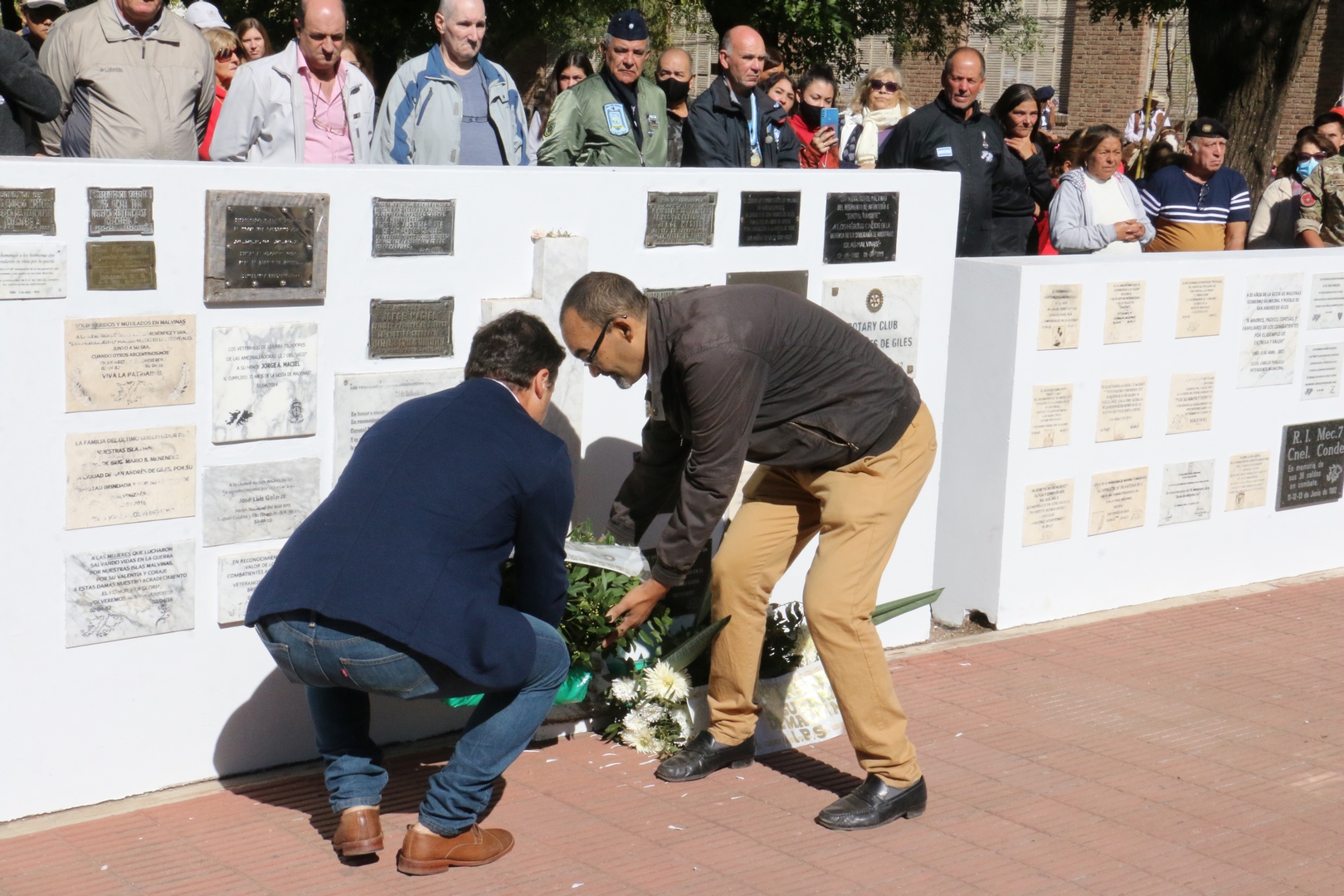 El intendente Miguel Gesualdi estuvo a cargo del toque de silencio, entregó una ofrenda de laurales y reconoció al veterano de guerra mendocino ‘‘EL GAUCHO RIVERO’’, músico oriundo de Mendoza que acompañó este evento local.