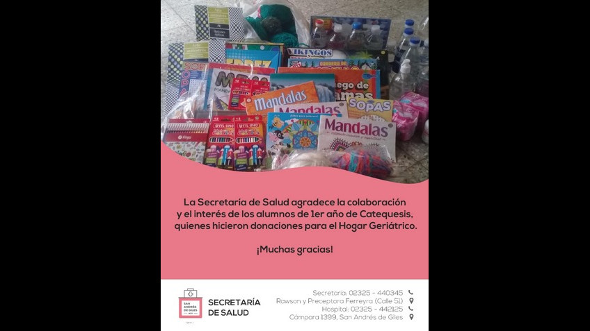 La Secretaría de Salud agradece la colaboración y el interés de los alumnos de 1er año de Catequesis, quienes hicieron donaciones para el Hogar Geriátrico.