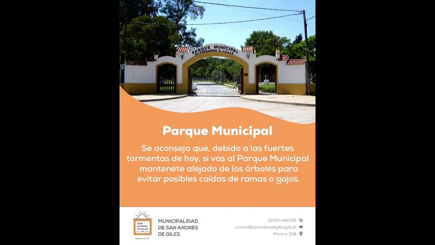 Se aconseja que, debido a las fuertes tormentas de hoy, si vas al Parque Municipal mantenete alejado de los árboles para evitar posibles caídas de ramas o gajos.