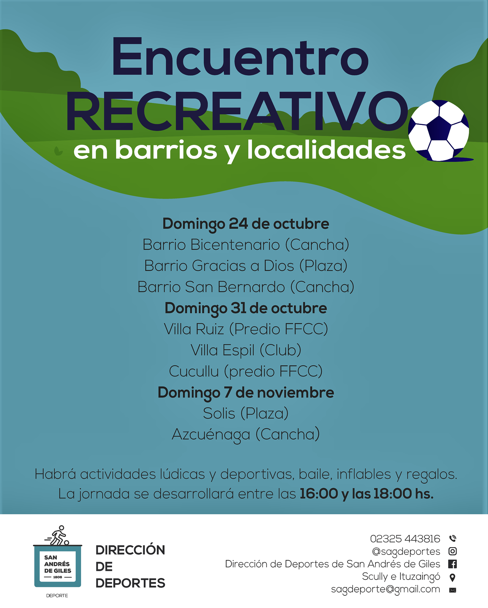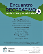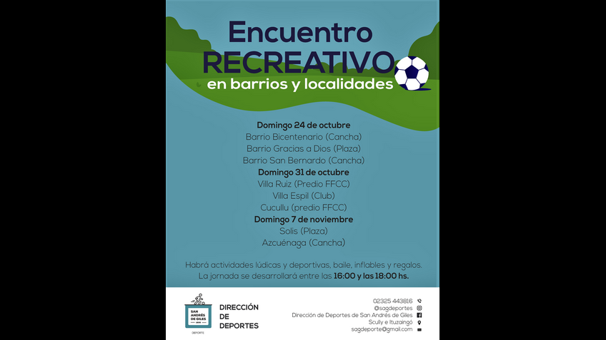 La Dirección de Deporte los invita a los “Encuentros deportivos y recreativos en barrios y localidades”. Se realizarán actividades lúdicas y deportivas para niños y niñas, baile para adolescentes y adultos, inflables para los más chicos, culminando con regalos para los participantes.