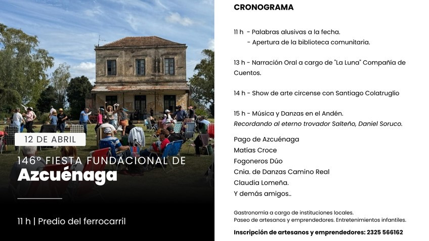 La Municipalidad de San Andrés de Giles invita a toda la comunidad y a los pueblos vecinos a celebrar el 146° Aniversario de la Fundación de Azcuénaga (1880-2026). El evento central se llevará a cabo el próximo domingo 12 de abril, a partir de las 11:00 h, en el emblemático Predio del Ferrocarril.