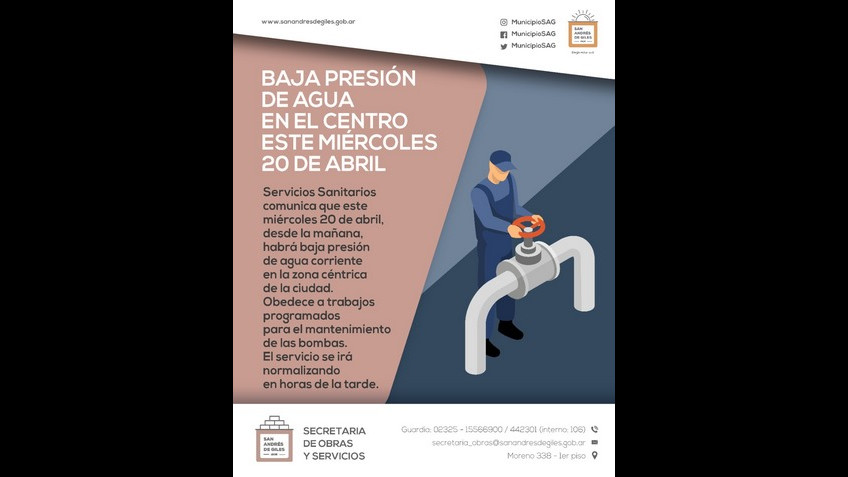 Servicios Sanitarios comunica que este miércoles 20 de abril, desde la mañana, habrá baja presión de agua corriente en la zona céntrica de la ciudad. Obedece a trabajos programados para el mantenimiento de las bombas.