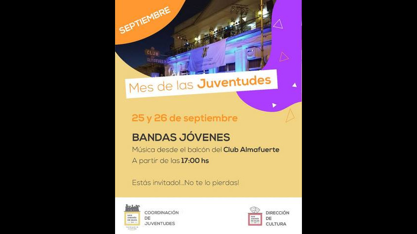 En el marco del Mes de las juventudes, el área de Cultura junto al área de Coordinación de Juventudes te invitan a escuchar BANDAS JÓVENES DESDE EL BALCÓN DEL CLUB ALMAFUERTE, el 25 y 26 de septiembre a partir de las 17 horas.