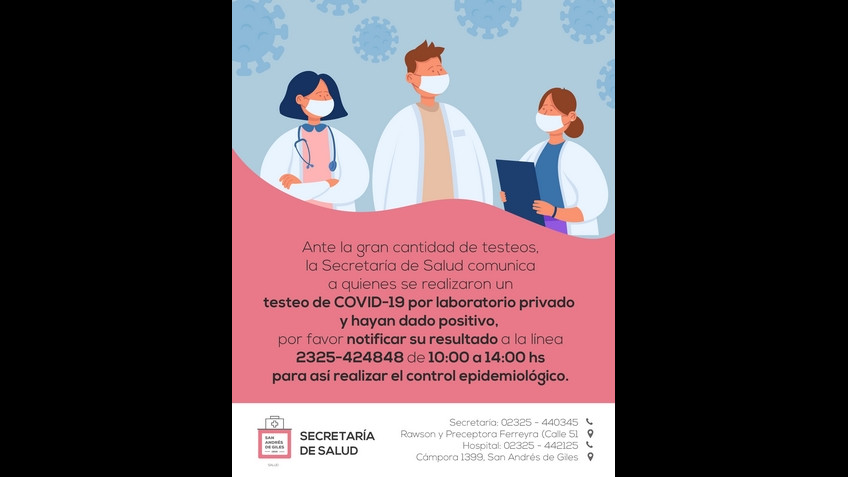 Ante la gran cantidad de testeos, la Secretaría de Salud comunica a quienes se realizaron un testeo de COVID-19 por laboratorio privado y hayan dado positivo,