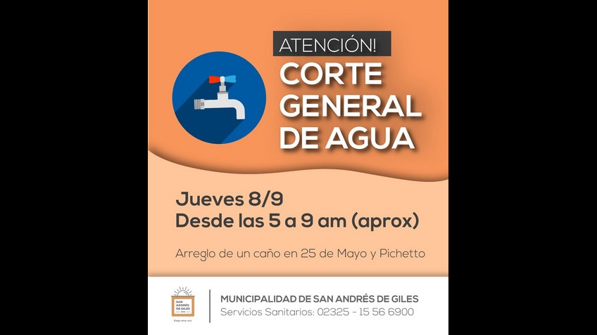 Este jueves de 05:00 a 09:00 horas aproximadamente, se realizará un corte general de agua corriente para trabajar en la reparación de un caño maestro ubicado en 25 de Mayo y Pichetto.
