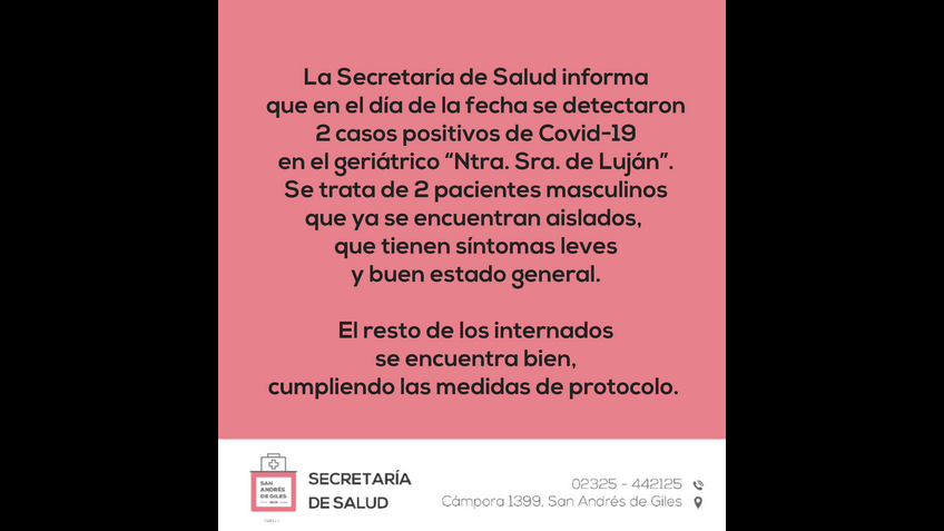 Dos casos positivos en el Hogar Geriátrico Nuestra Señora de Luján