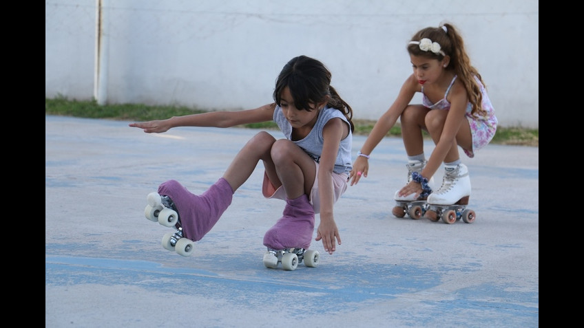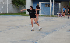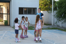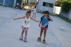 La docente brinda las indicaciones necesarias para ir mejorando la actividad del patín sobre ruedas en la pista promoviendo desde los primeros pasos hasta movimientos más estilizados.
