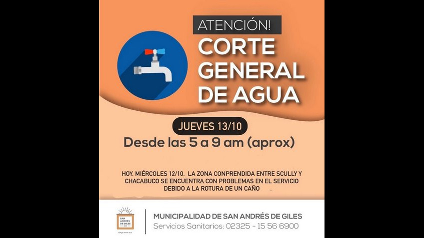 La Secretaría de Obras y Servicios Públicos comunica que debido a la rotura de un caño, hay problemas en el suministro del agua desde Scully y Chacabuco y sus alrededores (zona noreste).