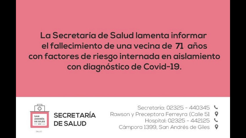 La Secretaría de Salud lamenta informar el fallecimiento de una vecina de 71 años con factores de riesgo internada en aislamiento con diagnóstico de Covid-19.