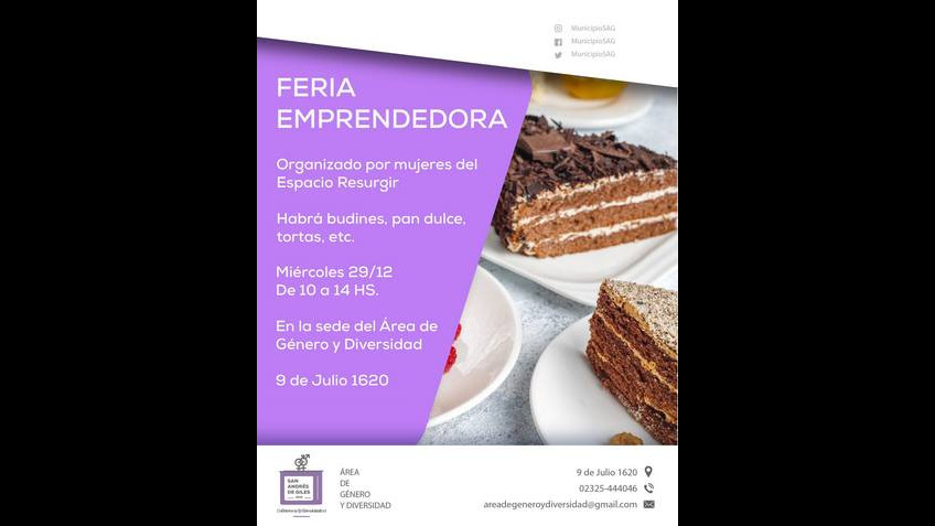 Feria Emprendedora Organizada por mujeres del Espacio Resurgir. Miércoles 29-12-2021 De 10 a 14 HS. Sede del Área de Género y Diversidad 9 de Julio 1620.