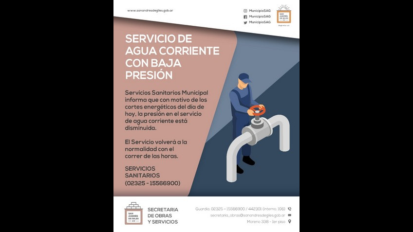 Servicios Sanitarios Municipal informa que con motivo de los cortes energéticos del día de hoy, la presión en el servicio de agua corriente está disminuida.