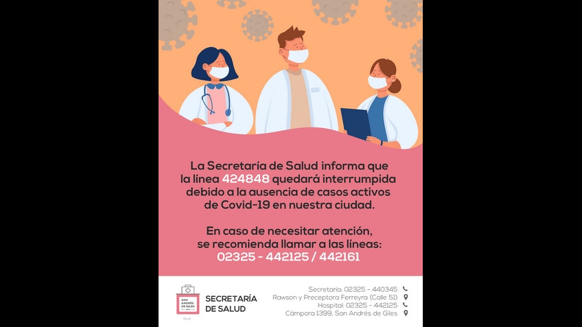 La Secretaría de Salud informa que la línea 424848 quedará interrumpida debido a la ausencia de casos activos de Covid-19 en nuestra ciudad.