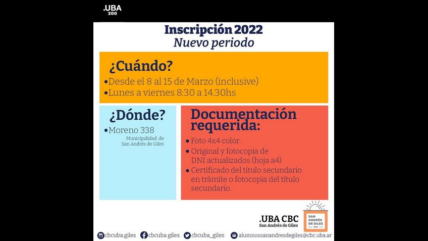 La fecha de la nueva instancia de inscripción a la Universidad de Buenos Aires para ingresantes 2022 en nuestra sede será desde el martes 8 de marzo al Martes 15 de marzo inclusive.