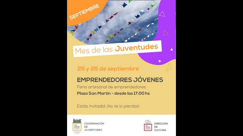 En el marco del Mes de las Juventudes, el área de Cultura junto al área de Coordinación de Juventudes te invitan a la Feria de JOVENES EMPRENDEDORES, el 25 y 26 de septiembre a partir de las 17 horas en Plaza San Martín.