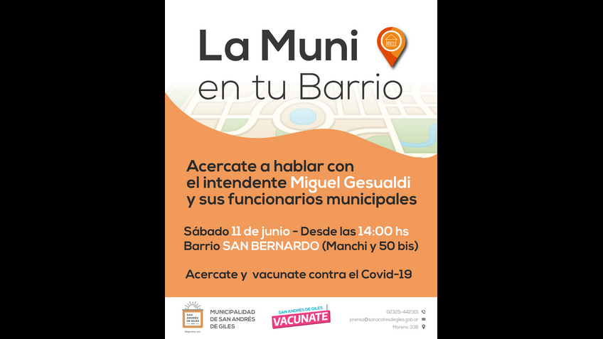 Así que ya sabes, este sábado 11 de junio a partir de las 14 hs, el intendente Miguel Gesualdi te espera para que te acerques a hablar con él y sus funcionarios Municipales en la esquina Manchi y 50 bis, barrio San Bernardo.