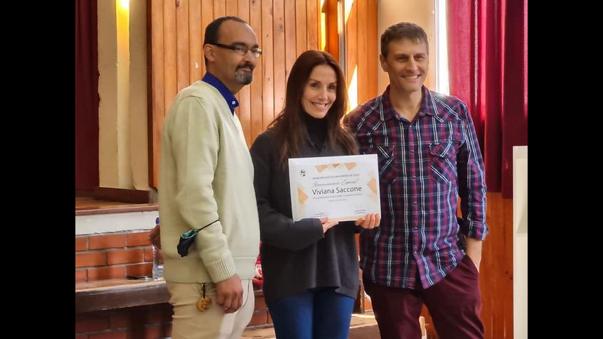 En el marco de una jornada de una clase abierta de actuación denominada “Juegos Teatrales para Cantantes”, la Municipalidad, a través de su director de Cultura, Turismo y Patrimonio, Ceferino Gallo hizo entrega este sábado 14 de mayo de un certificado de reconocimiento a Viviana Saccone. Fue en la Escuela de nuestro vecino Nacho Mascardi que tiene sede en el Colegio Nuestra Señora de Luján.