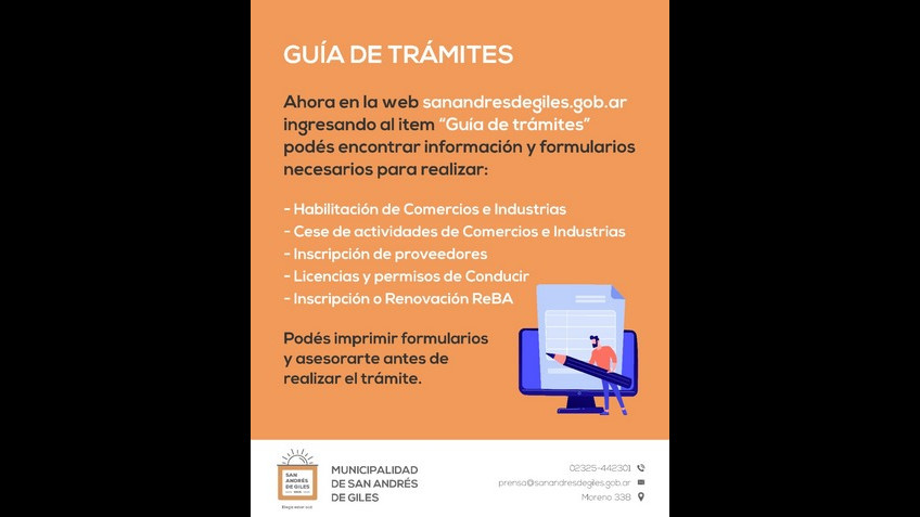 Guía de trámites en la web municipal Ahora en la web sanandresdegiles.gob.ar ingresando al item “Guía de trámites” podés encontrar información y formularios necesarios para realizar: