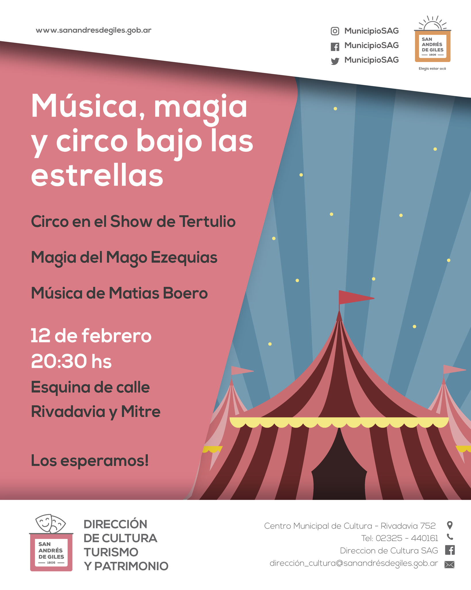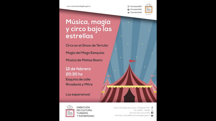 La Dirección de Cultura, Turismo y Patrimonio te espera este sábado 12 de febrero a las 20:30 hs en la esquina de Rivadavia y Mitre para que disfrutes de una noche llena de diversión con los siguientes números: