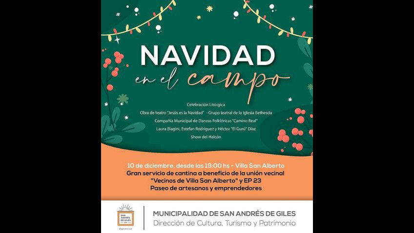HOY! Te esperamos para compartir la “NAVIDAD en el Campo” en San Alberto! Números en vivo: -Celebración Litúrgica -Obra de teatro "Jesús es la Navidad" del Grupo teatral de la Iglesia Bethesda -Compañía Municipal de Danzas Folklóricas "Camino Real" - Laura Biagini, Estefan Rodríguez y Héctor "El Gurú" Díaz - Show del Halcón Te esperamos hoy!, 10 de diciembre, desde las 19:00 hs - Villa San Alberto Además habrá gran servicio de cantina a beneficio de la unión vecinal “Vecinos de Villa San Alberto" y EP 23 y paseo de artesanos y emprendedores! No te lo pierdas!