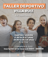 En Villa Ruiz: Martes y jueves, de 17:30 (para niños de 5 a 7 años) y 18:30 horas (de 8 a 12 años) en el Club,  a cargo de la prof. Julieta Castiello.