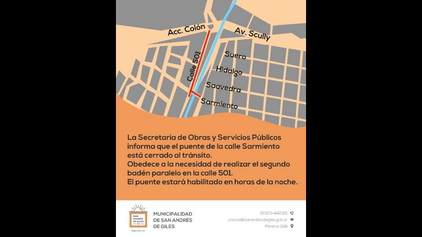 La secretaría de Obras y Servicios Públicos informa que el puente de la calle Sarmiento está cerrado al tránsito. Obedece a la necesidad de realizar el segundo badén paralelo en la calle 501.