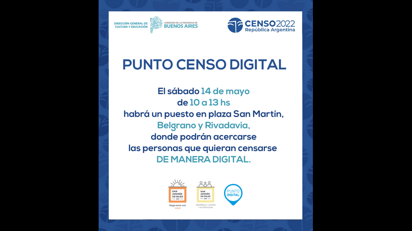 El sábado 14 de mayo de 10 a 13 hs habrá un puesto en plaza San Martín, Belgrano y Rivadavia, donde podrán acercarse las personas que quieran censarse DE MANERA DIGITAL.