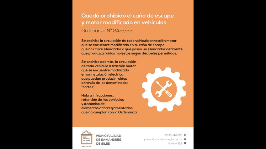Mediante la misma se prohíbe la circulación de todo vehículo a tracción motor que se encuentre modificado en su caño de escape, que no utilice silenciador o que posea un silenciador deficiente que produzca ruidos molestos según decibeles permitidos.