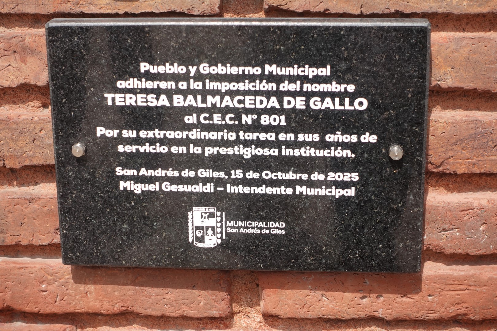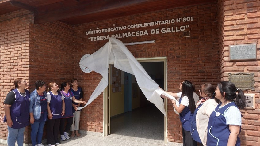 El miércoles 15 de octubre, se impuso el nombre de Teresa Balmaceda de Gallo al Centro Educativo Complementario N° 801 ubicado en av. Scully 1181, entre San Lorenzo e Ituzaingó.