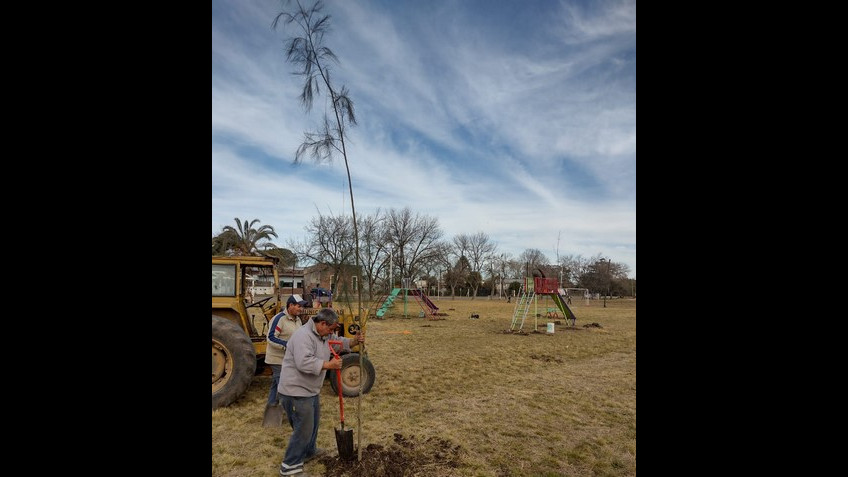 La forestación de Villa Ruiz mejoró en los últimos días con la colocación de 20 fresnos y 20 casuarinas en la zona de la ex estación de tren y en la calle San Martín, recién repavimentada.