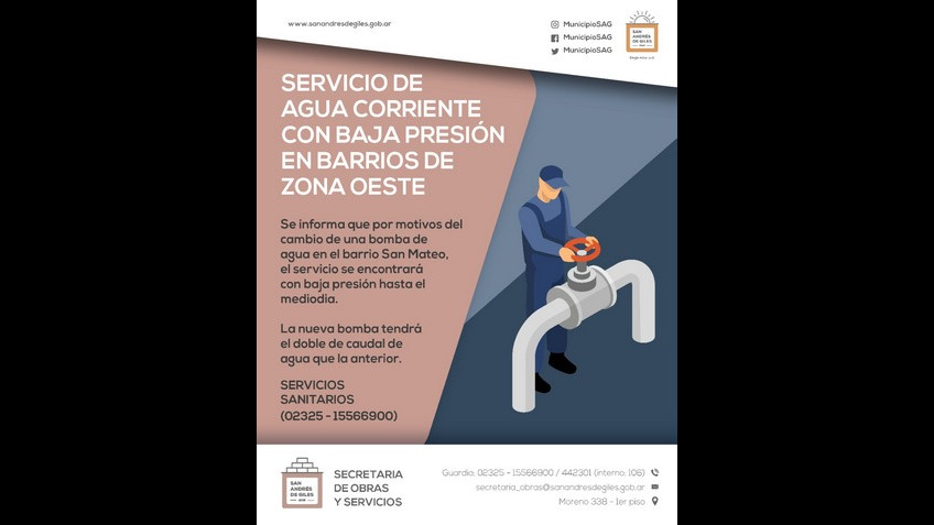 Se informa que por motivos del cambio de una bomba de agua en el barrio San Mateo, el servicio se encontrará con baja presión hasta el