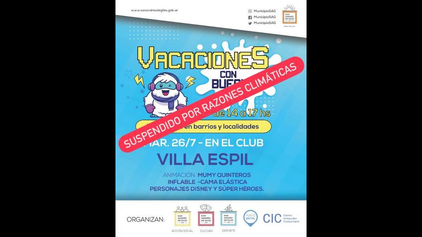 Por razones climáticas fueron suspendidas las Vacaciones con Bufanda este martes 26 en Villa Espil.
