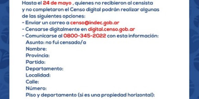 Hasta el 24 de mayo, quienes no recibieron al censista y no completaron el Censo digital podrán realizar algunas de las siguientes opciones