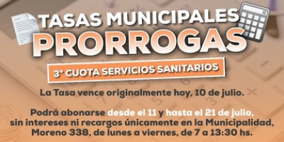 Prórroga en la 3ª. Cuota de la Tasa por Servicios Sanitarios
