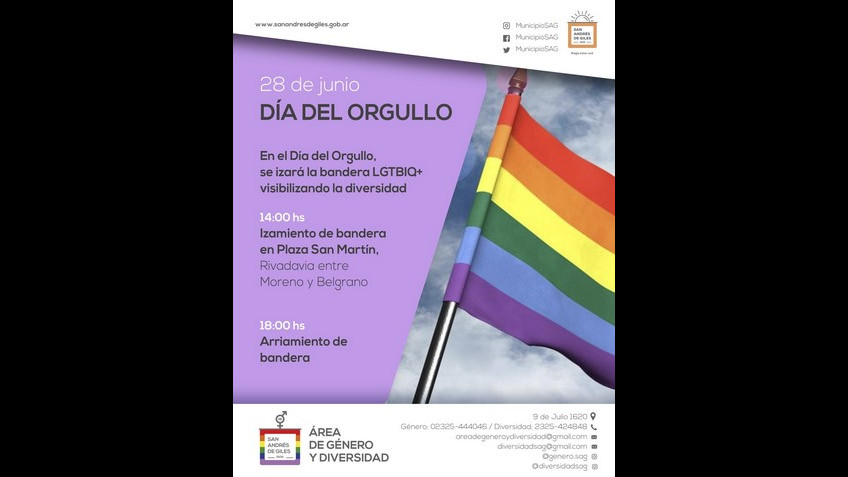 En el Día del Orgullo, se izará la bandera lgtbiq+ visibilizando la diversidad 14:00 hs: Izamiento de bandera en Plaza San Martín,Rivadavia entre Moreno y Belgrano 18:00 hs: Arrío de la bandera.