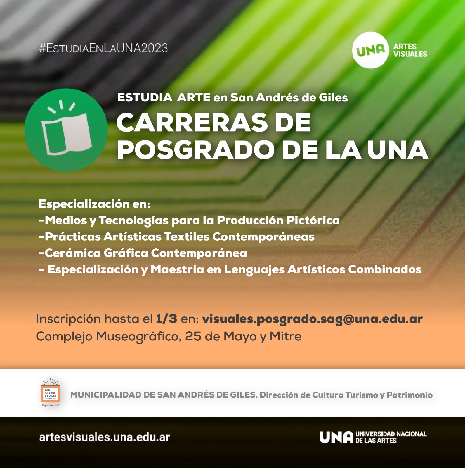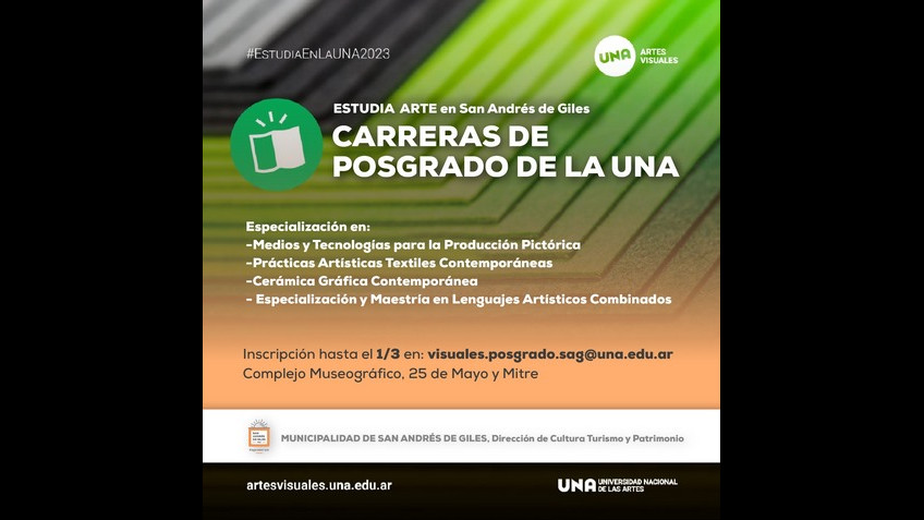 Se encuentra abierta la inscripción 2023 hasta el 1 de marzo para las carreras de Posgrado de la UNA (Universidad Nacional de las Artes), Departamento de Artes Visuales, sede San Andrés de Giles.