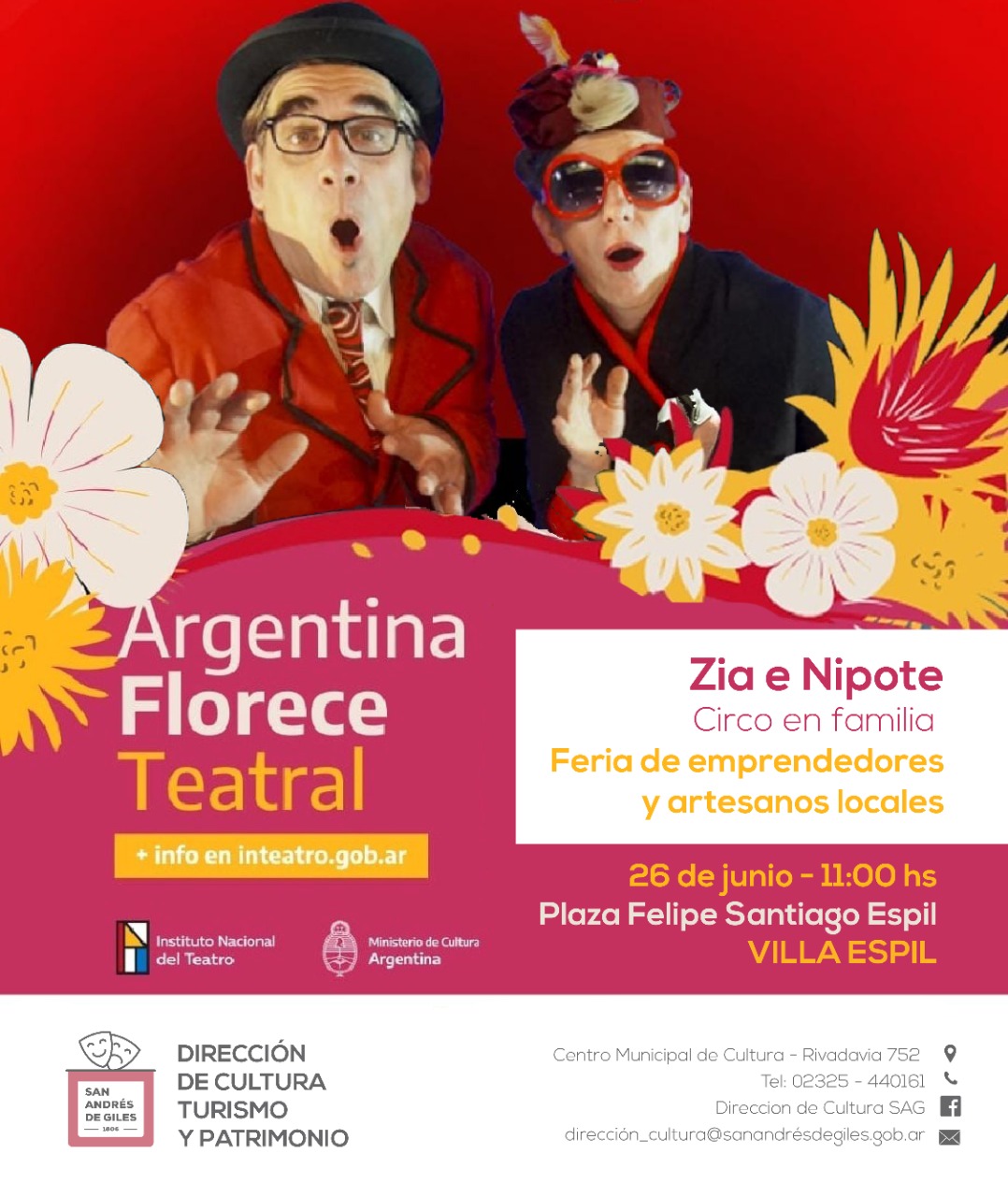 El 26 de junio a las 11 horas en la plaza Felipe Santiago Espil de la localidad de Villa Espil, se presenta Argentina Florece Teatral con Zia e Nipote, Circo en familia.