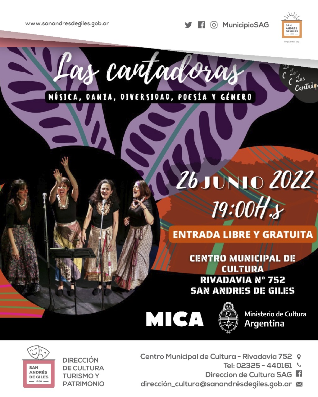 El grupo de música “Las Cantadoras” se presentarán en el Centro Municipal de Cultural, el domingo 26 de junio a las 19 horas, con entrada libre y gratuita.