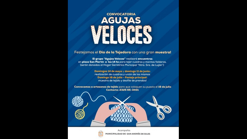 El grupo de tejido “Agujas Veloces” se reunió en abril y lo hará en mayo y junio finalizando el 16 de julio con una muestra de tejidos artesanales y realizando distintas actividades. Siempre en plaza San Martín, a partir de las 14:00 horas.