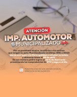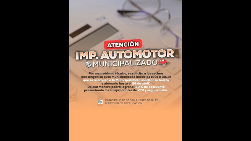 La Dirección de Recaudación solicita a los vecinos que tengan su auto Municipalizado (modelos 1991 a 2012) se acerquen a la Municipalidad a solicitar su boleta y abonarla hasta el 26 de abril. Por un problema técnico no se distribuyeron las boletas en los domicilios.