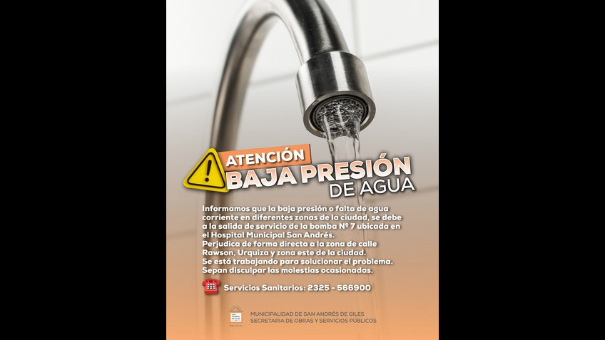 La baja presión o falta de agua corriente en diferentes zonas de la ciudad, se debe a la salida de servicio de la bomba Nº 7 ubicada en el Hospital Municipal San Andrés.