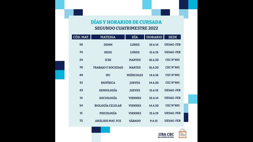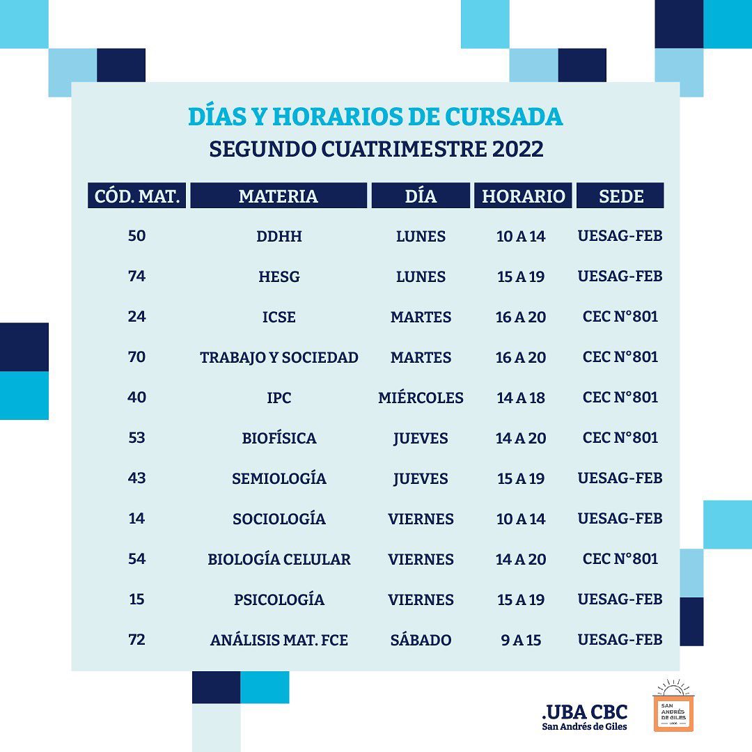 Compartimos los días y horarios de las materias del Segundo Cuatrimestre, el mismo tendrá inicio la semana del 16 de agosto.