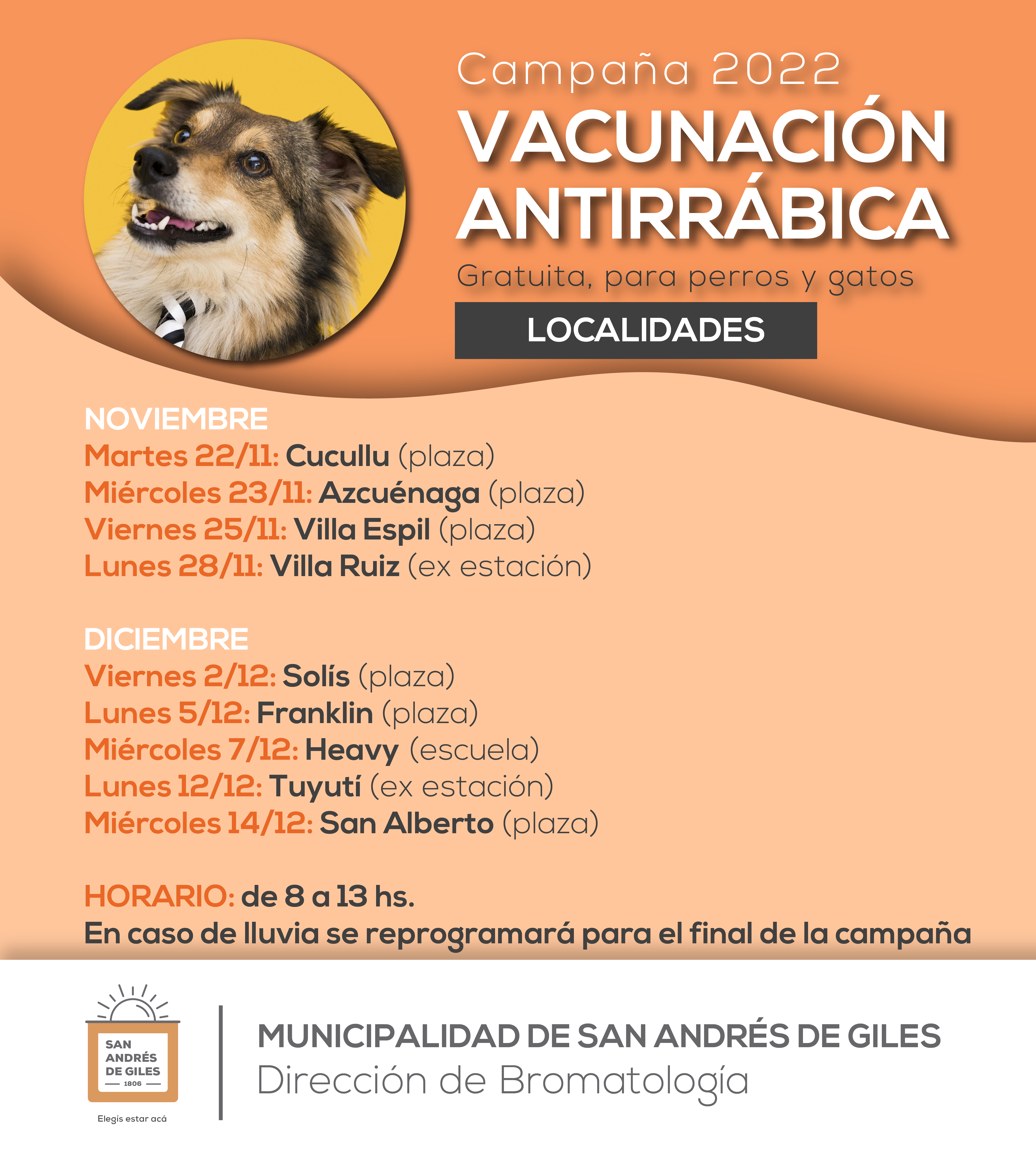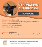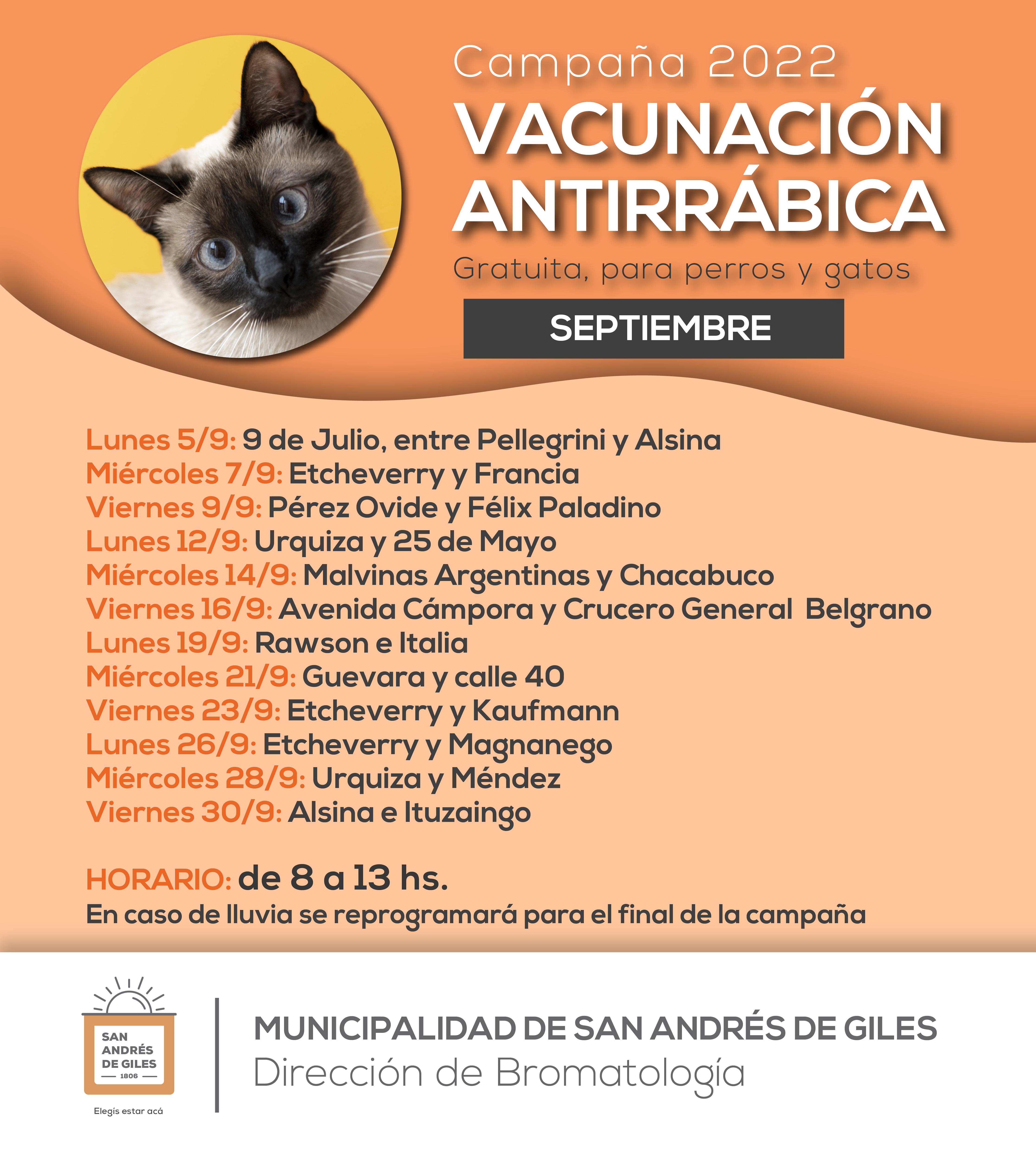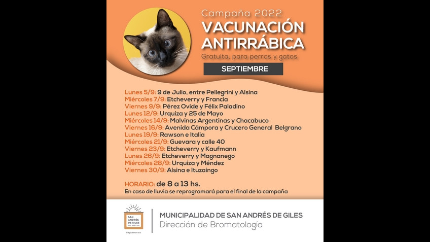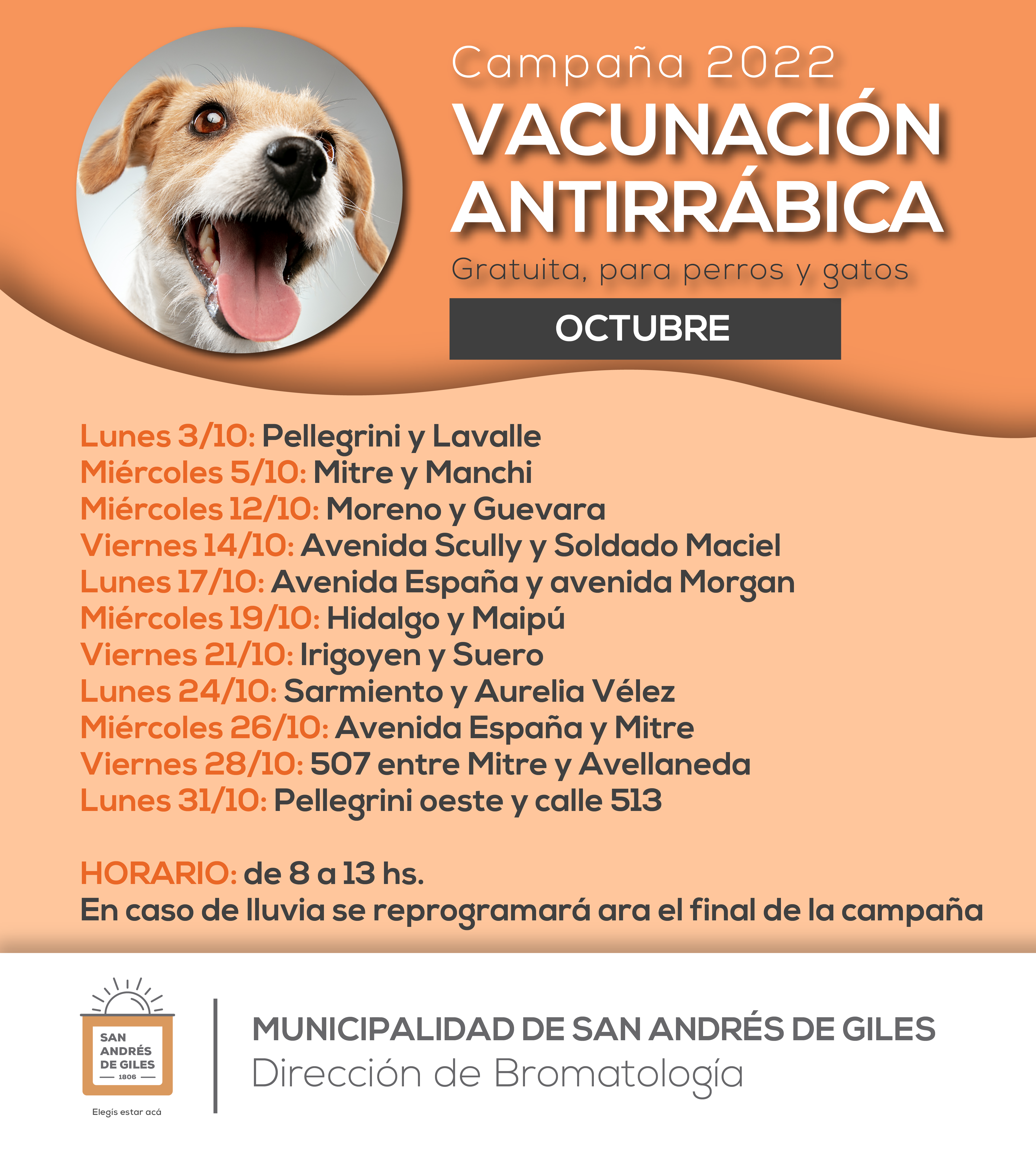 Dirección Municipal de Bromatología: fechas programadas para la Campaña de Vacunación Antirrábica gratuita 2022 para perros y gatos.