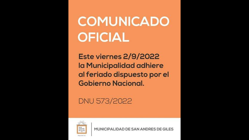 Este viernes 2/9/2022 la Municipalidad adhiere al feriado dispuesto por el Gobierno Nacional.