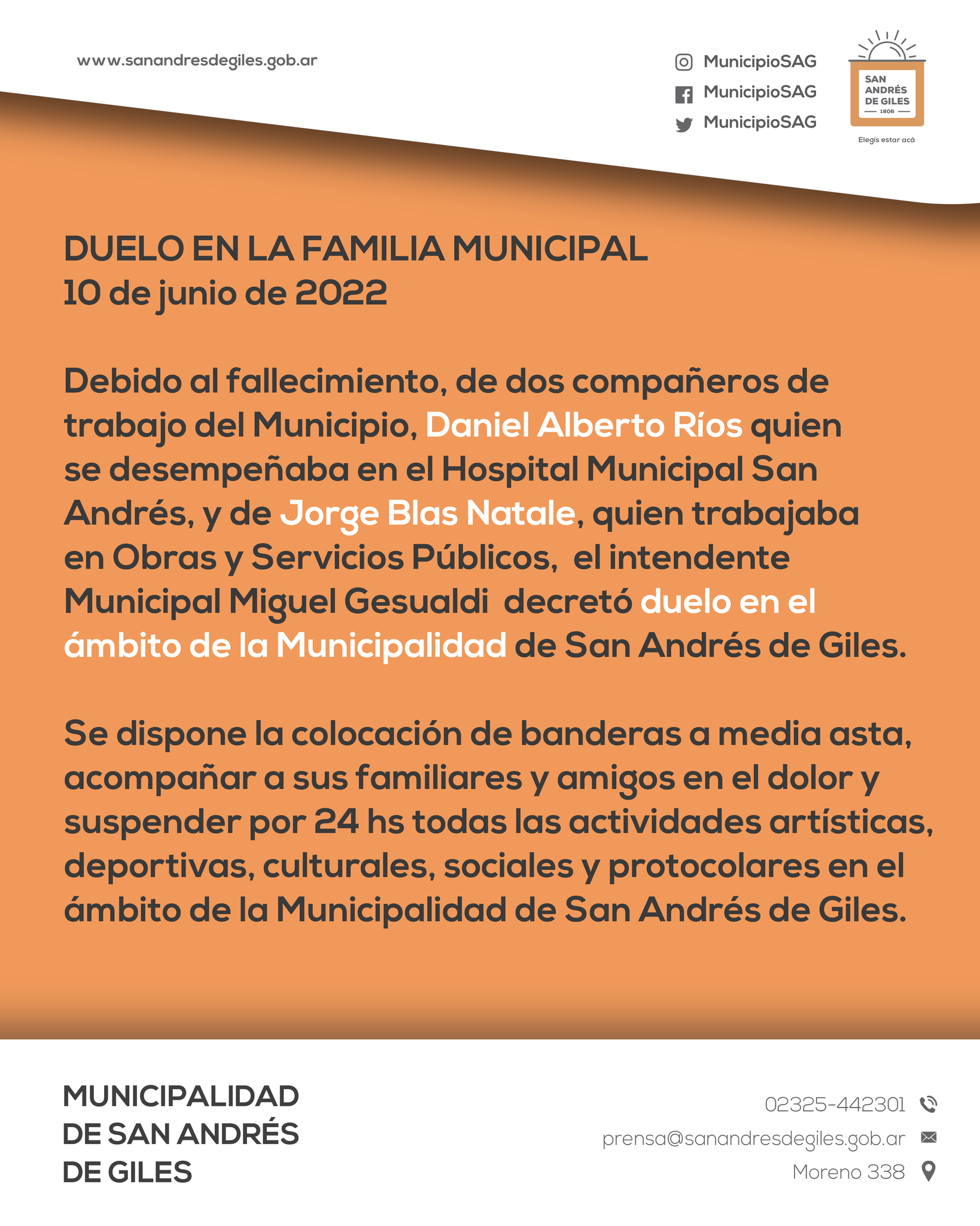 Se dispone la colocación de banderas a media asta, acompañar a sus familiares y amigos en el dolor y suspender por 24 horas todas las actividades artísticas, deportivas, culturales, sociales y protocolares en el ámbito de la Municipalidad de San Andrés de Giles.