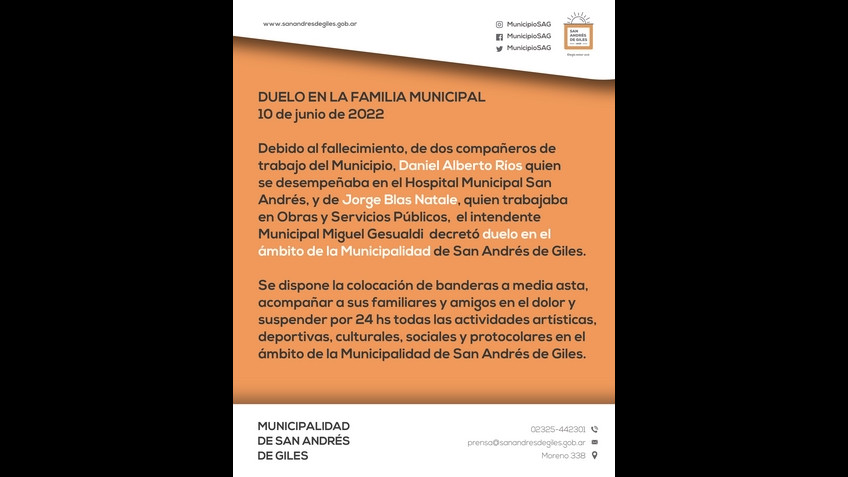 Debido al fallecimiento, de dos compañeros de trabajo del Municipio, Daniel Alberto Ríos quien se desempeñaba en el Hospital Municipal San Andrés, y de Jorge Blas Natale, quien trabajaba en Obras y Servicios Públicos, el intendente Municipal Miguel Gesualdi decretó duelo en el ámbito de la Municipalidad de San Andrés de Giles.