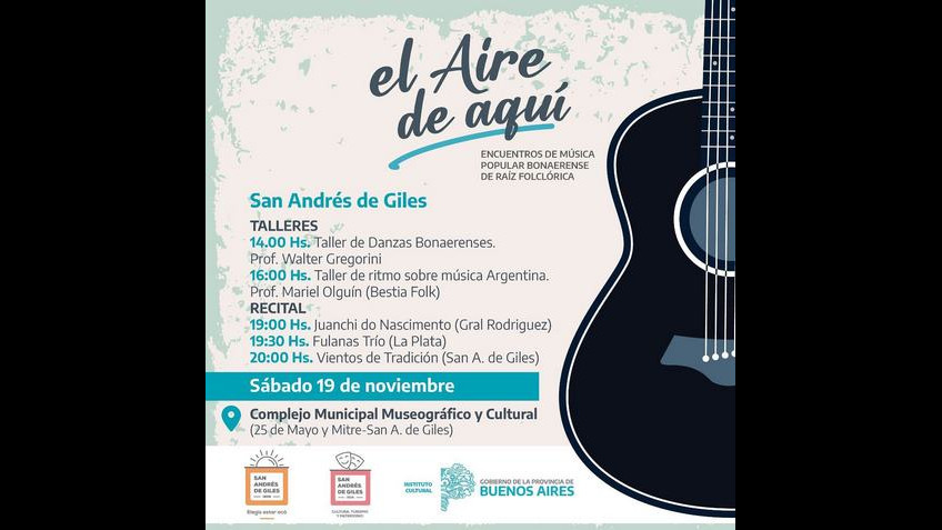 El Instituto Cultural de la Provincia de Buenos Aires, a través del programa “El Aire de Aquí”, invita al encuentro de música popular de raíz folklórica bonaerense a realizarse el próximo sábado 19 de noviembre en el Complejo Municipal Museográfico y de Cultura de San A. de Giles (25 de Mayo y Mitre).