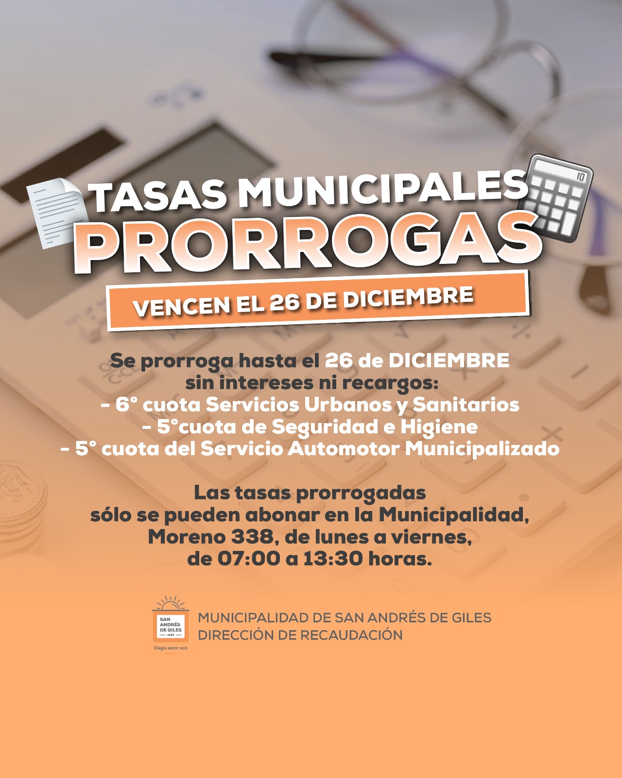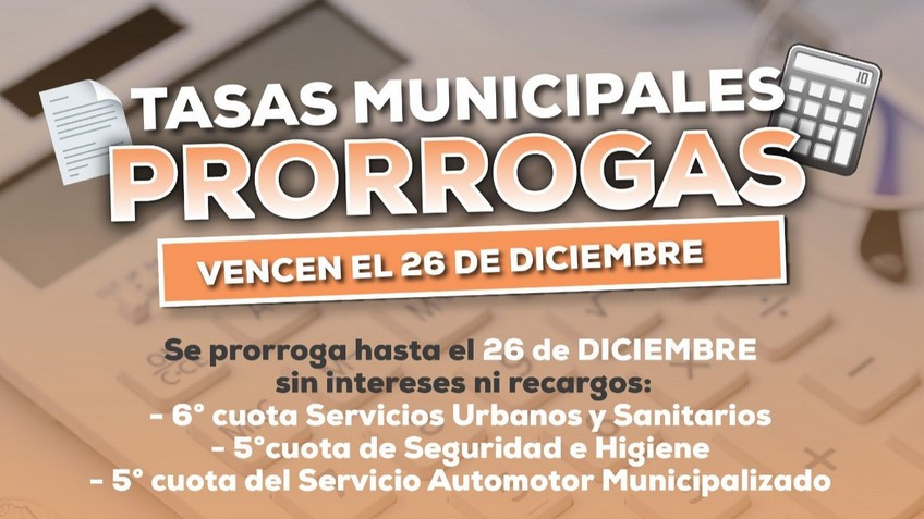 Se prorroga la 6ª. cuota de la Tasas por Servicios Urbanos y Servicios Sanitarios; también la 5ª. cuota de la Tasa de Seguridad e Higiene y del Impuesto Automotor Municipalizado.