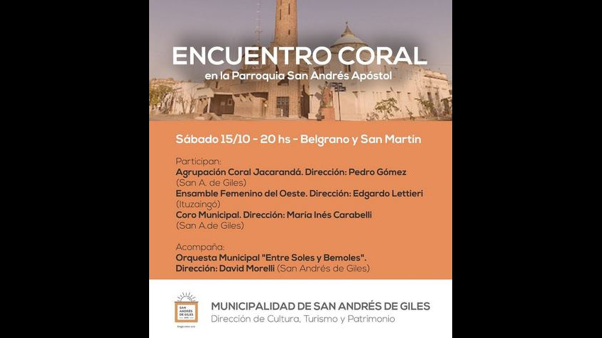 ENCUENTRO CORAL en la Parroquia San Andrés Apóstol Sábado 15/10-20hs - Belgrano y San Martin Participan: Agrupación Coral Jacarandá. Dirección: Pedro Gómez (San A. de Giles) Ensamble Femenino del Oeste. Dirección: Edgardo Lettieri (Ituzaingó) Coro Municipal. Dirección: Maria Inés Carabelli (San A.de Giles) Acompaña: Orquesta Municipal "Entre Soles y Bemoles". Dirección: David Morelli (San Andrés de Giles)