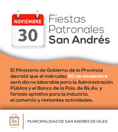 El Ministerio de Gobierno de la Provincia decretó que el miércoles 30 de noviembre será día no laborable para la Administración Pública y el Banco de la Provincia de Buenos Aires, y feriado optativo para la industria, el comercio y restantes actividades.